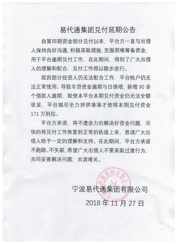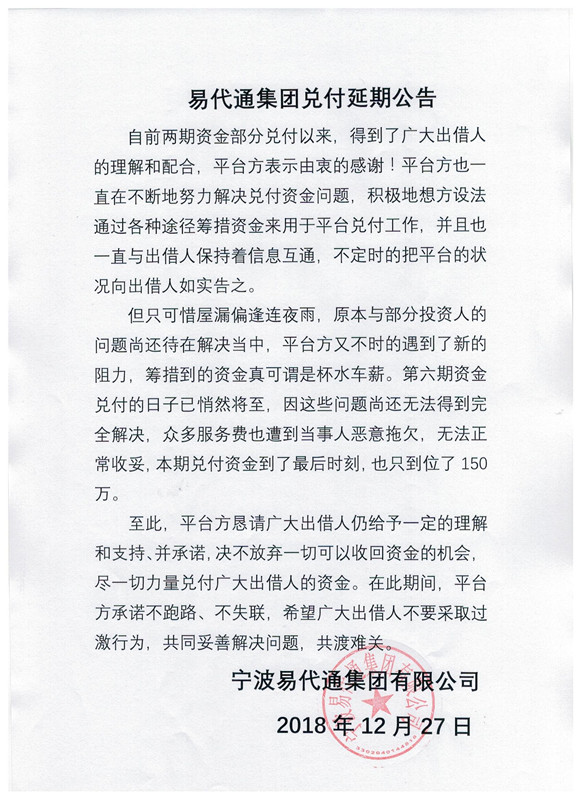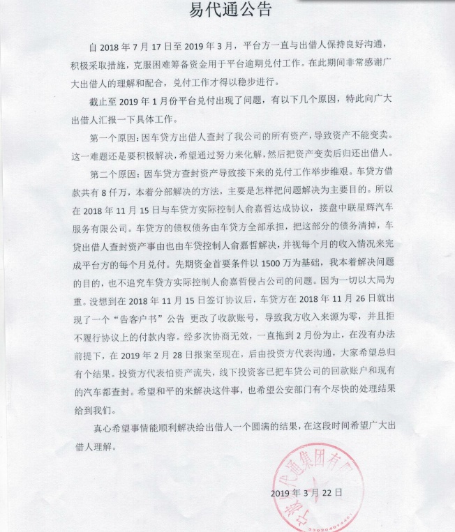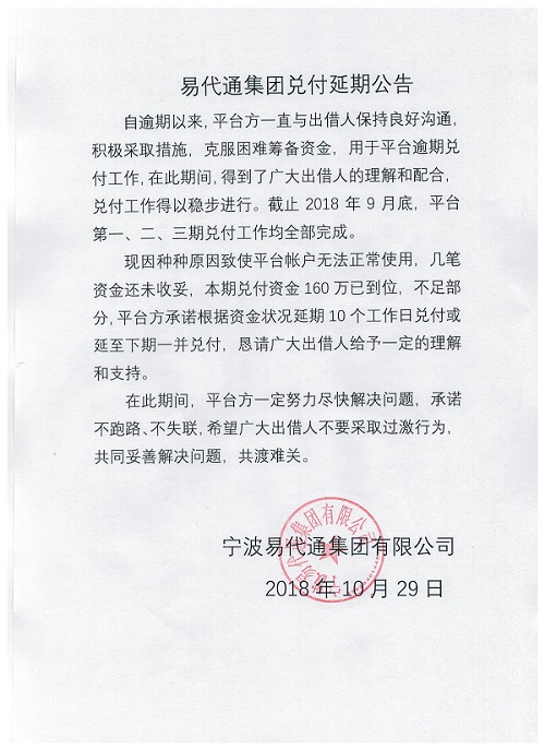 易贷在线 2019.4.17-13:14……易代通兑付情况