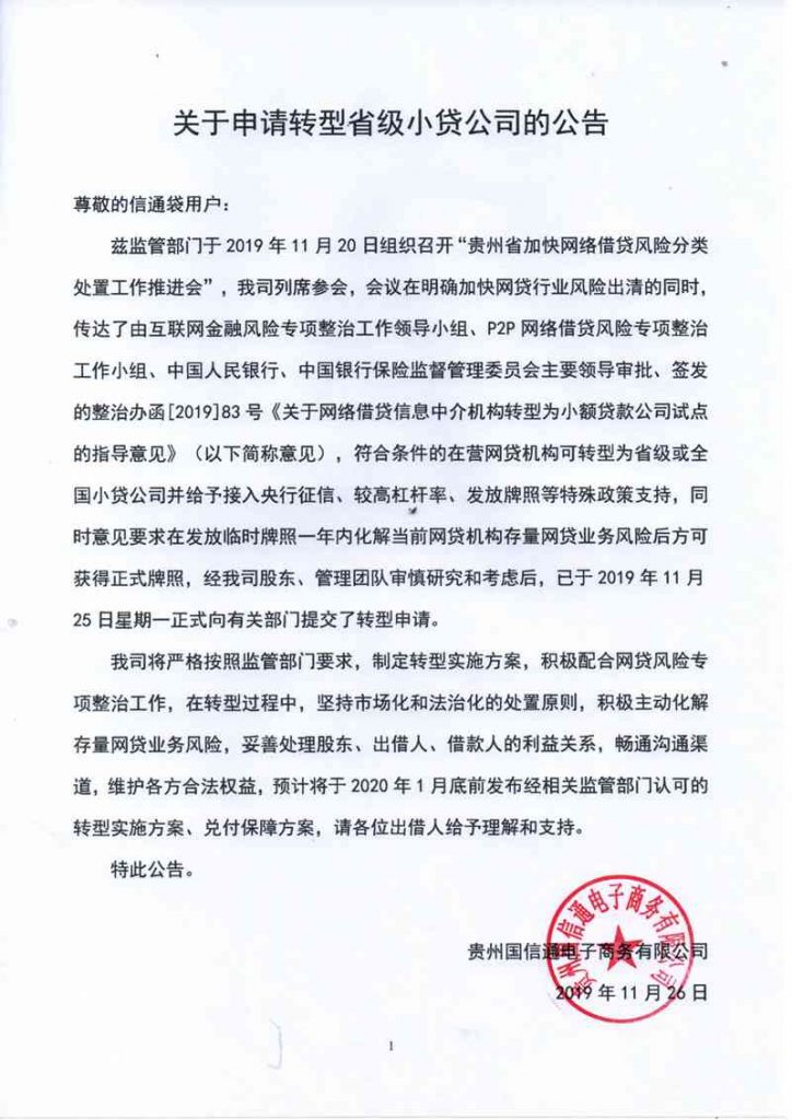 监管部门于2019年11月20日组织召开“贵州省加快网络借贷风险分类处置工作推进会”,会议在明确加快网贷行业风险出清的同时,传达了由互联网金融风险专项整治工作领导小组、P2P网络借贷风险专项整治工作小组、中国人民银行、中国银行保险监督管理委员会主要领导审批、签发的整治办函[2019]83号《关于网络借贷信息中介机构转型为小额贷款公司试点的指导意见》(下简称“意见 ” ),符合条件的在营网贷机构可转型为省级或全国小贷公司并给予接入央行征信、较高杠杆率、发放牌照等特殊政策支持,同时意见要求在发放临时牌照一年内化解当前网贷机构存量网贷业务风险后方可获得正式牌照。经我司股东、管理团队审慎研究和考虑后,已于2019年11月25日正式向有关部门提交了转型申请。