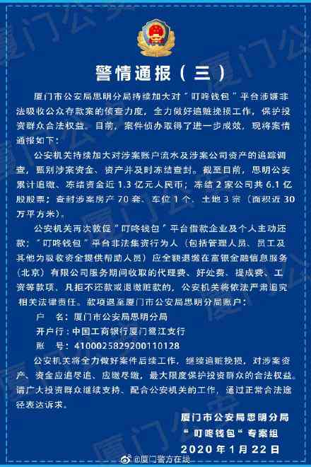 【厦门警方关于“叮咚钱包”平台涉嫌非法吸收公众存款案的情况通报(三)】