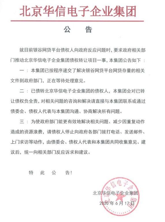 华信电子就目前银谷网货平台债权人反应问题时,要求相关部门推动华信电子债权转让项目一事,本集团公告如下: