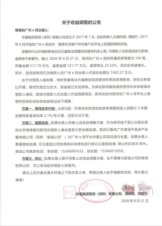 广州e贷平台2020年8月31日收到合作方华星融资租赁(深圳)有限公司(简称“华星公司”)及其实际控制人谭尚明、周励行发来的《关于收益调整的公告》(详见附件),其表示:由于对借款人催收难,同时受最高法大幅降低民间借贷利率的政策影响,新的业务难以开展,公司代偿压力巨大,资金链已无法持续。目前华星公司在广州e贷平台推荐并担保的项目存量金额517.79万元,逾期贷款121.77万元,逾期率达23.52%,华星公司已代偿1562.57万元。为保证公司能持续经营并在未来继续向借款人催收,继续为借款人向出借人代偿到期项目,华星公司决定对其在广州e贷平台上推荐并担保的项目的收益做出调整。