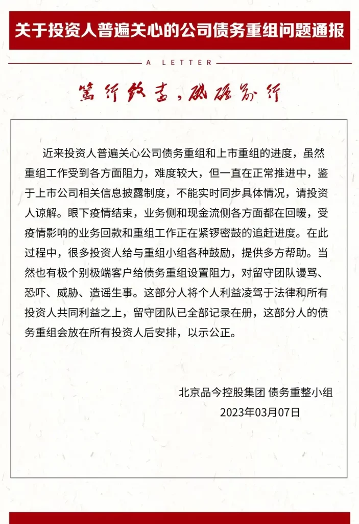 近来投资人普遍关心公司债务重组和上市重组的进度,虽然重组工作受到各方面阻力,难度较大,但一直在正常推进中,鉴于上市公司相关信息披露制度,不能实时同步具体情况,请投资人谅解。眼下疫情结束,业务侧和现金流侧各方面都在回暖,受疫情影响的业务回款和重组工作正在紧锣密鼓的追赶进度。在此过程中,很多投资人给与重组小组各种鼓励,提供多方帮助。当然也有极个别极端客户给债务重组设置阻力,对留守团队谩骂、恐吓、威胁、造谣生事。这部分人将个人利益凌驾于法律和所有投资人共同利益之上,留守团队已全部记录在册,这部分人的债务重组会放在所有投资人后安排,以示公正。