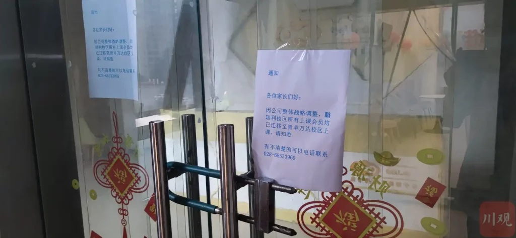 位于成都市青羊区光华东3路西成尚锦社区门口的贝尔机器人中心鹏瑞利店,二楼店招上的“贝尔机器人”5个大字,目前只剩下了“机器人”3个字。从一楼到二楼的楼梯间中,记者看到还有没来得及撤掉的机器人编程课程海报,以及贝尔编程中心的简介。该店在二楼的大门早已紧闭,玻璃门上面贴着两张告知上课会员迁移校区的通知。在紧闭的大门背后,门店的前台上还有一支没有来得及拿走的签字笔。“这家店已经关了两三个月了,今年过了年以后就没有怎么开。”旁边培训机构的一位老师告诉记者。