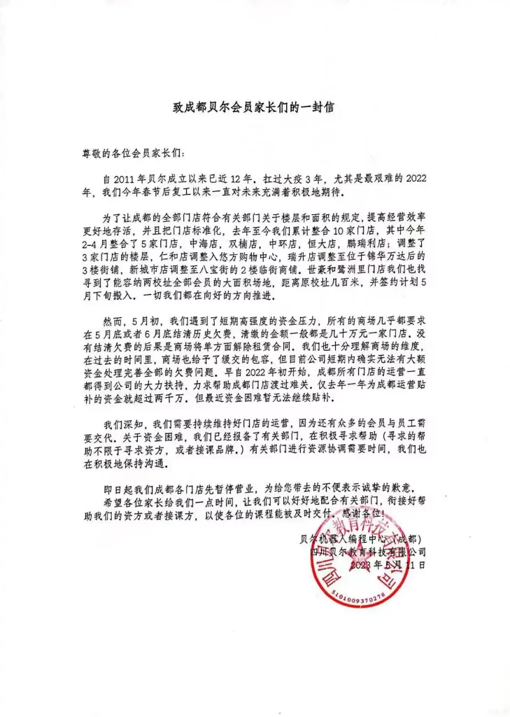 5月11日,四川贝尔教育科技有限公司(以下简称“贝尔教育”)发布了一份致成都家长们的公告。其内容显示,今年5月初,因遭遇“短期高强度的资金压力”,成都各门店暂停营业。