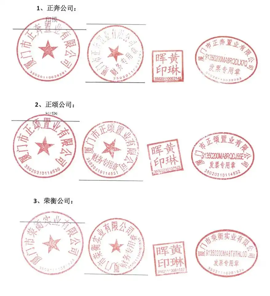 二、我公司郑重提示社会公众:鉴于厦门荣奔及厦门梁星违法私刻的三家公司公章及所变更的法定代表人不具备法律效力,正奔公司、正颂公司、荣衡公司及三家公司新任法定代表人杨高潘代表公司所从事的借款、担保、投资、签署商品房买卖合同以及其他所有的行为均为无效。原公章和法人章等印鉴样式详见下图,请社会公众提高警惕,注意识别,避免上当受骗。