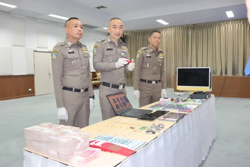 Three luxury cars, over 5 million baht in cash, 30 gold ornaments, luxury watches, brand-name bags, computers, mobile phones, SIM cards, bank account books, gold certificates, and other valuables were seized from the suspected gang boss and his associates.