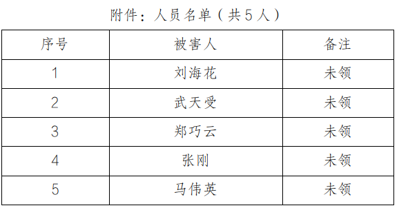 ➤于强、陈凯犯诈骗罪一案中,请刘海花等5名受害人联系本院执行局办理领款手续。人员名单(共5人):刘海花、武天受、郑巧云、张刚、马伟英。