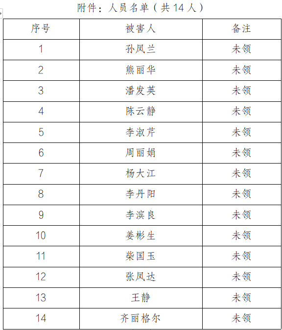 ➤王慧丽犯掩饰、隐瞒犯罪所得罪一案中,请孙凤兰等14名受害人联系本院执行局办理领款手续。人员名单(共14人):孙凤兰、熊丽华、潘发英、陈云静、李淑芹、周丽娟、杨大江、李丹阳、李滨良、姜彬生、柴国玉、张凤达、王静、齐丽格尔。