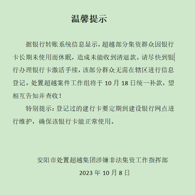 河南安阳市超越集团非法集资案 2023.10.8……【资金清退】安阳市处置超越集团涉嫌非法集资工作指挥部温馨提示:据银行转账系统信息显示,超越部分集资群众因银行卡长期未使用而休眠,造成未能收到清退款。请尽快到银行办理银行卡激活手续,该部分群众无需在辖区进行信息登记。处置超越案件工作组将于10月18日统一补款。