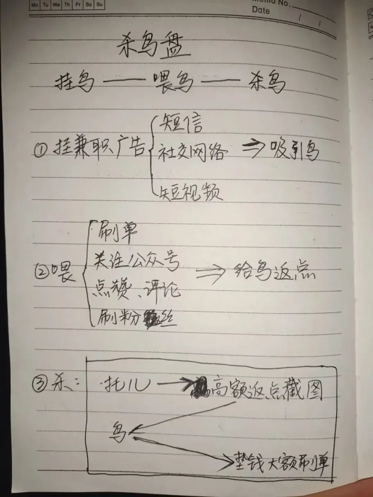 笔记中的“杀鸟盘”就是最常见的刷单返利类诈骗,所谓“杀鸟盘”,取的是“笼中鸟”之意,指长期生活在家的全职太太、宅男等群体,这类人群与外界接触较少,又想通过互联网获得收入,容易被兼职刷单返利诱惑,从而被骗。
