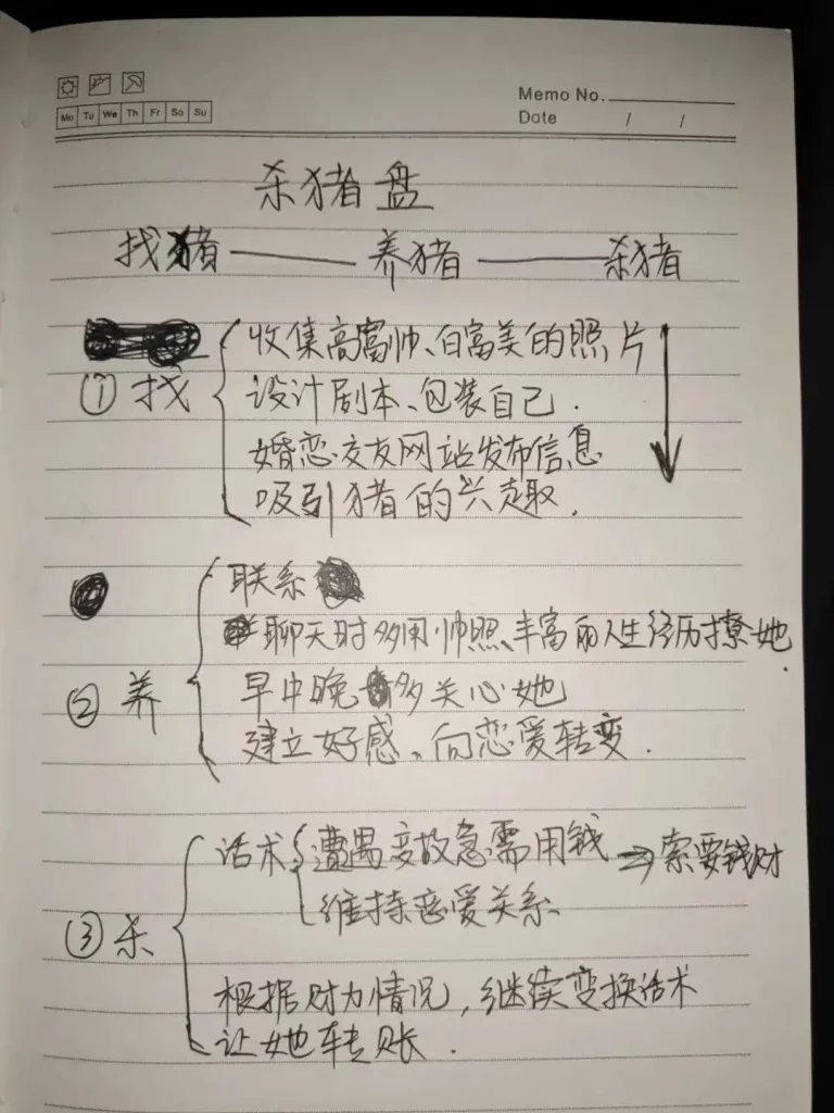 这一页写的是“杀猪盘”诈骗的作案手法,是骗子对婚恋、交友类诈骗的俗称,是指骗子把自己包装成“高富帅”或“白富美”,通过婚恋平台寻找受害人,披着爱情外衣、用甜言蜜语欺诈,进而用各种话术骗取受害人的钱财,在诈骗过程中,骗子把受害者叫做“猪”,把恋爱叫做“养猪”,把实施诈骗叫做“杀猪”。