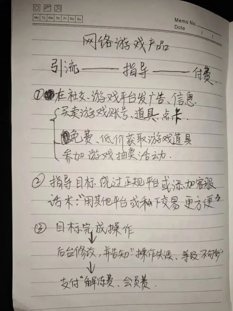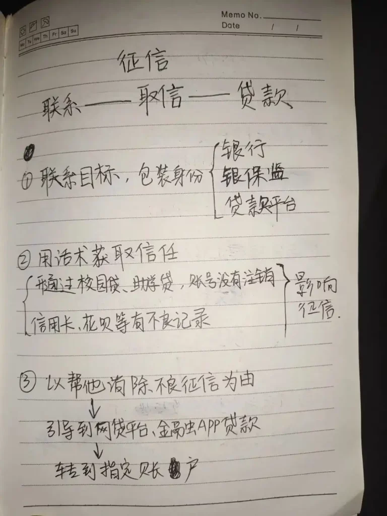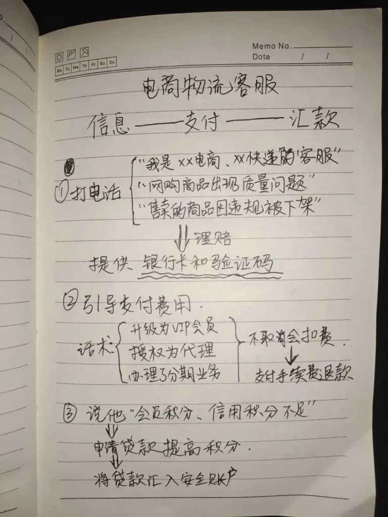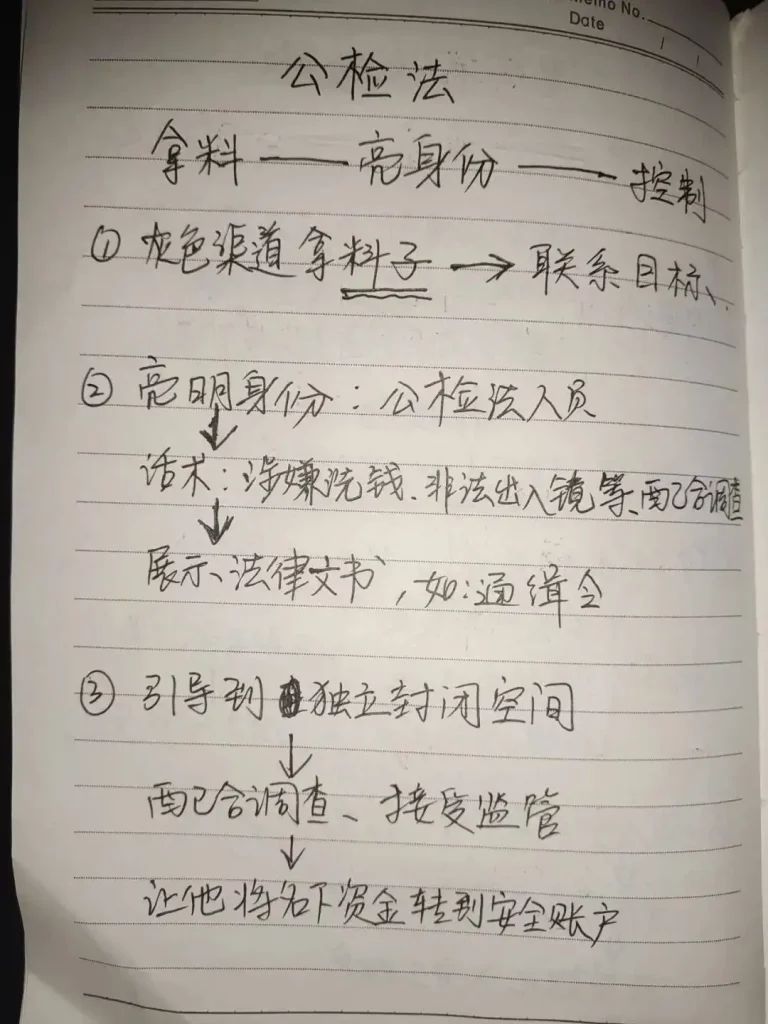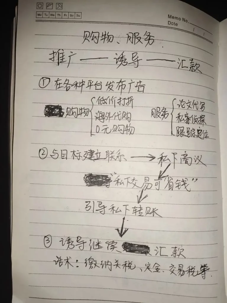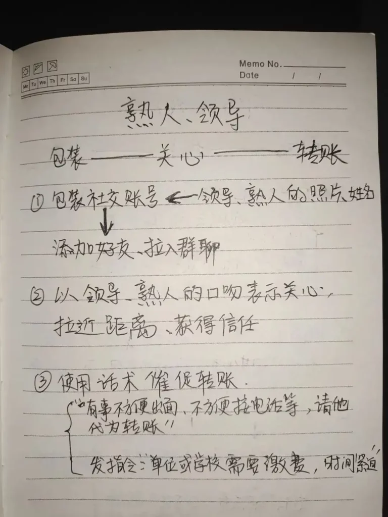 笔记里的“料子”是骗子的行业黑话,指身份证号、手机号等公民个人信息,骗子冒充公检法的工作人员联系受害人,以涉嫌洗钱、非法出入境等罪名要求配合调查,并展示虚假的法律文书,使受害人陷入恐惧,进而引导其进入封闭空间,防止与外界联系,再让受害人将资金转到指定“安全账户”。