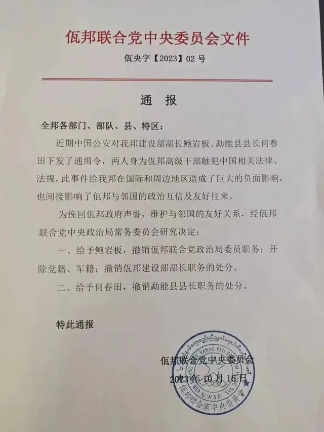 缅北两官员鲍岩板、何春田涉电诈遭中方通缉后被撤职 2023.10.16……【媒体报道】据佤邦联合党中央委员会通报,鲍岩板、何春田身为佤邦高级干部触犯中国相关法律、法规,被中国公安下发通缉令,在国际和周边地区造成了巨大的负面影响,也间接影响了佤邦与邻国的政治互信及友好往来。为挽回佤邦政府声誉,维护与邻国的友好关系,经佤邦联合党中央政治局常务委员会研究决定:给予鲍岩板撤销佤邦联合党政治局委员职务,开除党籍、军籍,撤销佤邦建设部部长职务的处分;给予何春田撤销勐能县县长职务的处分。