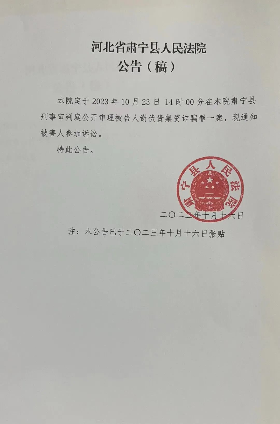 河北省沧州市肃宁县被告人谢伏贵集资诈骗罪一案 2023.10.16……【法院通告】河北省肃宁县人民法院定于2023年10月23日14时00分在本院肃宁县刑事审判庭公开审理