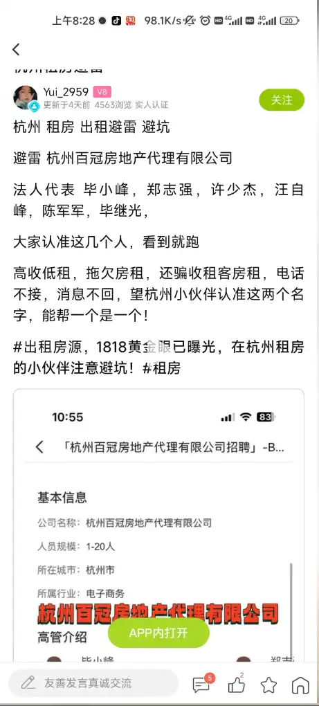 有网友表示,这家公司已涉及上百位租客和房东,金额预计达几百万,目前关于金额等没有定论。帖文内容显示,该房屋中介公司为杭州百冠房地产代理有限公司。据天眼查资料,该公司目前注册地址为拱墅区北上新城,而就在一个月前,注册地址还是拱墅区冬泽巷,这期间发生了地址变更。