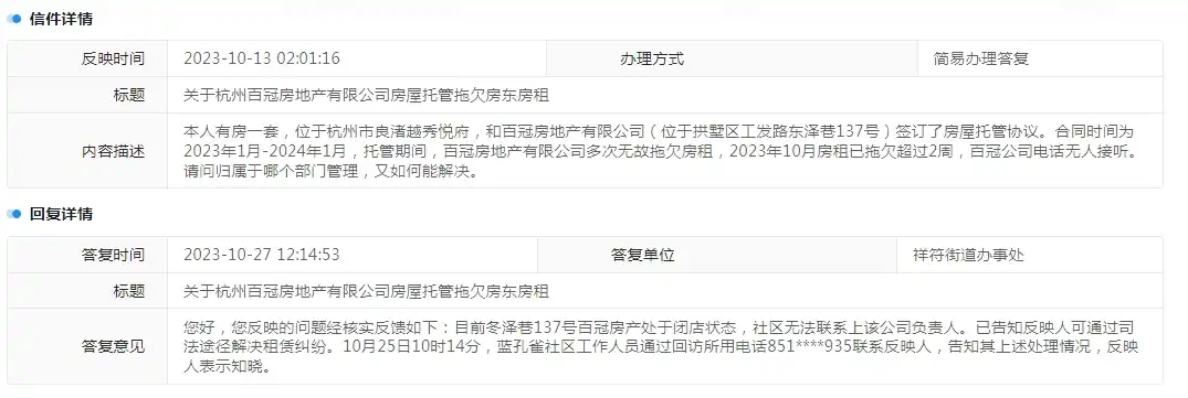 同时,在民呼我为平台上也有房东投诉过该中介公司,对此祥符街道答复表示,目前冬泽巷137号百冠房产处于闭店状态,社区无法联系上该公司负责人。