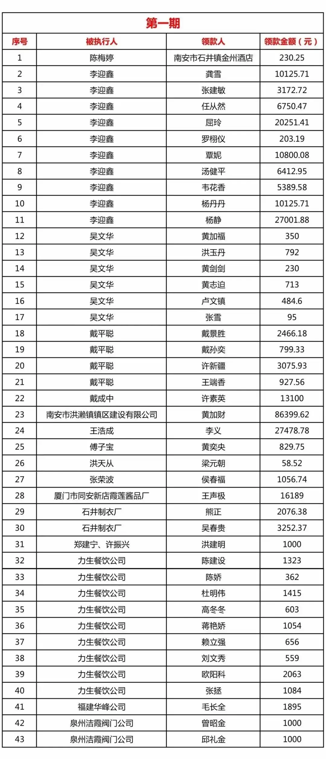 福建南安法院领取执行案款(第1期) 2023.11.16……【资金清退】南安市人民法院对至今未领取的执行款进行全面清理,现将清理过程中无法通过其他方式联系权利人的执行款予以公告,请相关权利人于本公告发布之日起30日内,携身份证明、执行款权利确认材料等资料联系本院办理执行款核对、认领等手续。逾期不核对、认领的,本院将依法提存,相关费用由权利人承担。