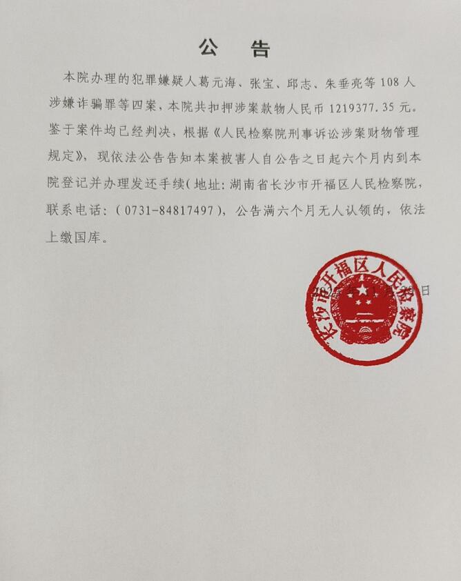 湖南省长沙市开福区葛元海、张宝、邱志、朱垂亮等108人涉嫌诈骗罪等四案 2023.11.29……【资金清退】本院办理的犯罪嫌疑人葛元海、张宝、邱志、朱垂亮等108人涉嫌诈骗罪等四案,本院共扣押涉案款物人民币1219377.35元。