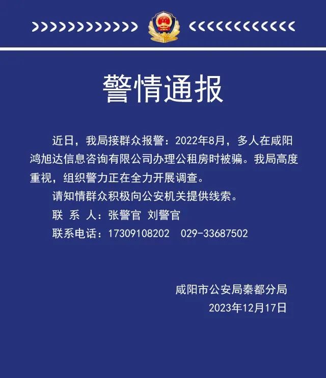 近日,我局接群众报警:2022年8月,多人在咸阳鸿旭达信息咨询有限公司办理公租房时被骗。我局高度重视,组织警力正在全力开展调查。请知情群众积极向公安机关提供线索。