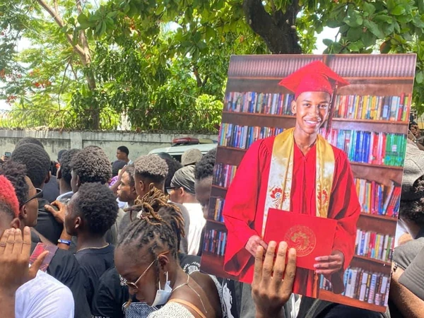 2025.8.22 Pandan plizyè jèn te prezan pou manifeste devan ministè levasyon nasyonal nan lide pou mande jistis ak ti Jenn enfliyansè (Zamy Winderson) sa ki te mouri ak bal yon sekirite ministè a pandan l tap pase sou moto l.