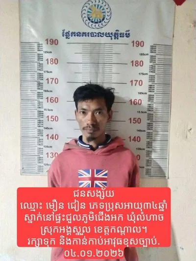 ប្រភពបានឲ្យដឹងថា នៅថ្ងៃទី០៤ ខែមករា ឆ្នាំ២០២៦ វេលាម៉ោង២១ និង៤៥នាទី កម្លាំងនគរបាលប៉ុស្ដិ៍រដ្ឋបាលរកាកោះ សហការជាមួយកម្លាំងប្រជាការពារល្បាតនៅចំណុចលើផ្លូវបេតុង ក្នុងភូមិតារោង ឃុំរកាកោះ ស្រុកគងពិសី ខេត្តកំពង់ស្ពឺ បានឃើញមុខសញ្ញាសង្ស័យម្នាក់ឈ្មោះ មឿន ជៀន ភេទប្រុស អាយុ៣៤ឆ្នាំមានស្រុកកំំណើតនៅភូមិតាកយ ឃុំព្រែកដំបូក ស្រុកស្រីសន្ធ ខេត្តកំពង់ចាម ។