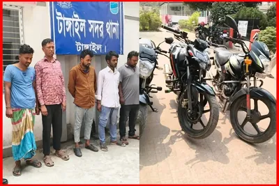 টাঙ্গাইলে চোরাই মোটরসাইকেলসহ আন্তঃজেলা চক্রের পাঁচ সদস্য গ্রেফতার টাঙ্গাইল সদর থানা পুলিশ অভিযান চালিয়ে তিনটি চোরাই মোটরসাইকেল ও আন্তঃজেলা মোটরসাইকেল চোর চক্রের পাঁচ সক্রিয় সদস্যকে গ্রেফতার করেছে। বুধবার গভীর রাতে শহরের বিভিন্ন এলাকায় পৃথক অভিযান চালিয়ে তাদের গ্রেফতার করা হয়। পুলিশ জানায়, তারা একটি সংঘবদ্ধ চক্রের সদস্য হয়ে দেশের বিভিন্ন জেলা থেকে মোটরসাইকেল চুরি করে টাঙ্গাইল ও আশপাশের এলাকায় সেগুলো বিক্রি করে আসছিল।টাঙ্গাইল সদর থানার অফিসার ইনচার্জ (ওসি)জানান,গোপন সংবাদের ভিত্তিতে এই অভিযান পরিচালনা করা হয়। এসময় তাদের কাছ থেকে তিনটি চোরাই মোটরসাইকেল জব্দ করা হয়েছে। গ্রেফতারকৃতদের বিরুদ্ধে সদর থানায় মামলা দায়েরের পর আজ বৃহস্পতিবার আদালতের মাধ্যমে কারাগারে পাঠানো হয়েছে। পুলিশের এমন সফল অভিযানে এলাকায় স্বস্তি ফিরেছে বলে জানিয়েছেন স্থানীয়রা।