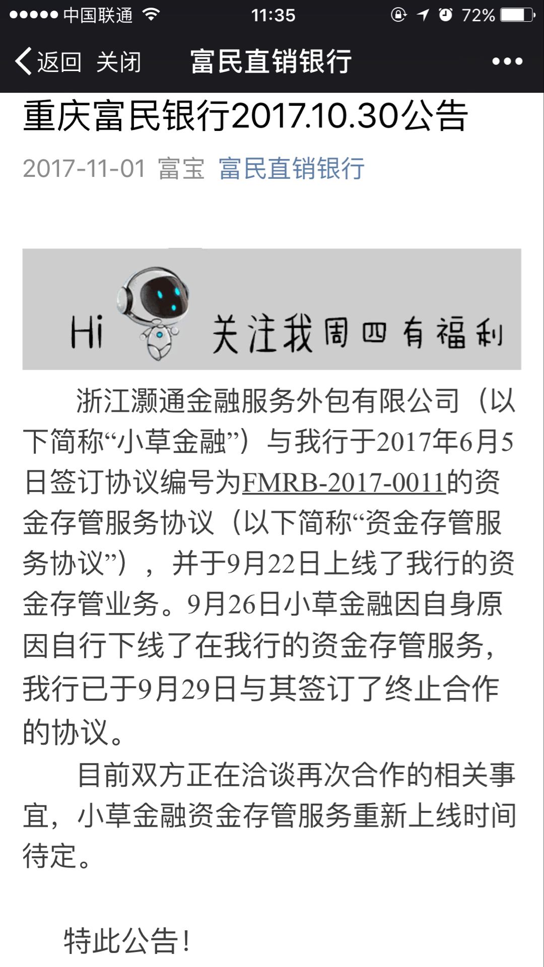 存管银行富民银行 — 小草金融【2017.11.2-11:36】