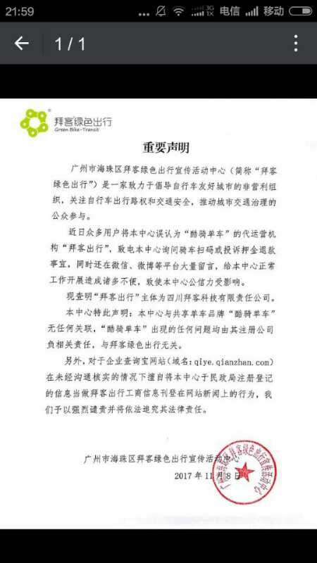 11月8日下午,四川拜客科技有限责任公司官方微信“拜客单车”发布消息称,我公司目前是酷骑单车新的第三方运营商,只负责单车的运营及维护,押金等其他费用类问题,需要您联系原酷骑公司咨询。我司作为新的运营商,为了照顾原酷骑用户,免费为原押金用户赠送骑行年卡一张,同时赠送价值29.9元的拜客出行会员卡一张,可3人共享,终身免押金,并从获得会员卡起,均可免费骑行一个月。