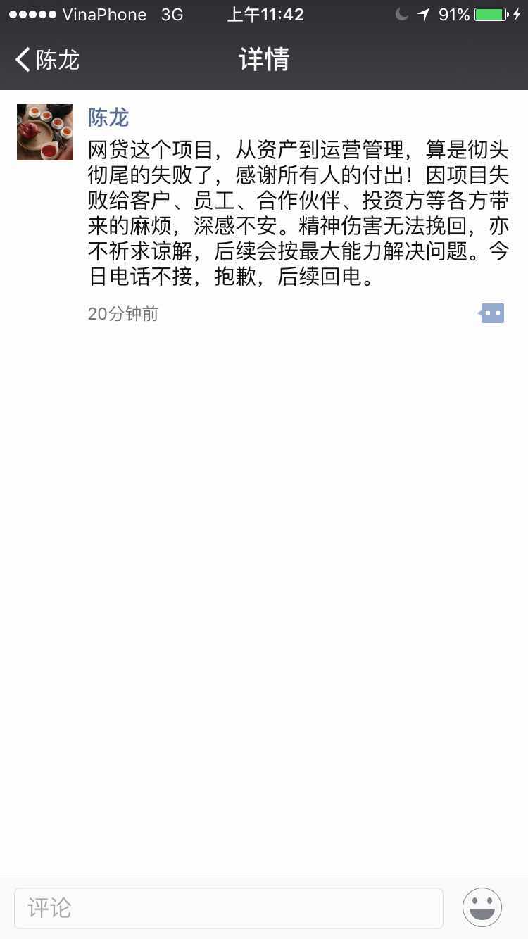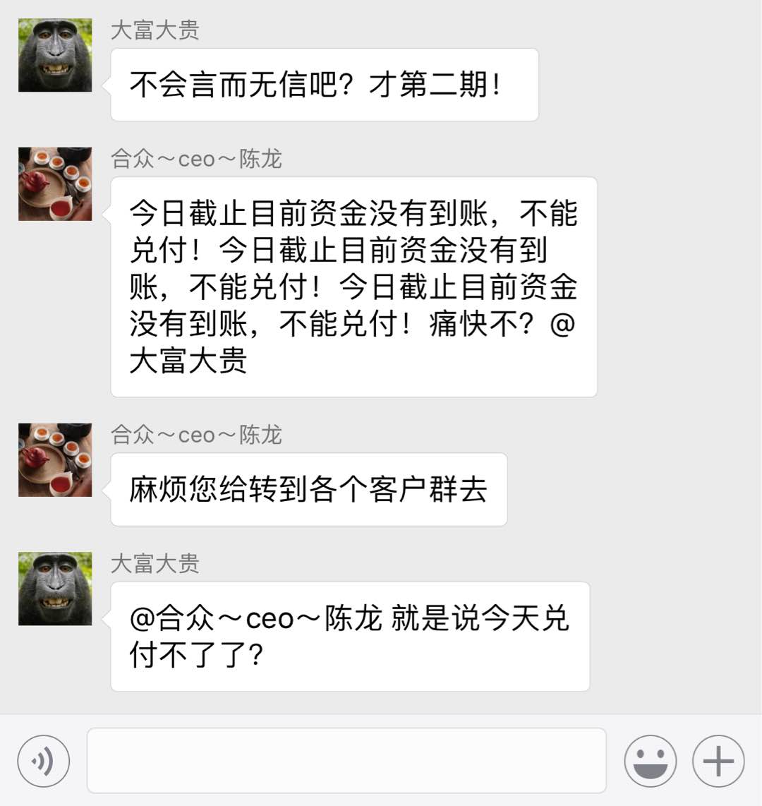 今日截止目前资金没有到账,不能兑付,痛快不?。。大家还在幻想吗?还在等施舍吗?不团结就等于纵容犯罪,纵容人家对你金钱的占有。。。他妈的钱圈跑了,就一句失败了。应该是成功诈骗了几千万,失败个毛线 — 合众金服【2017.11.28-17:21】