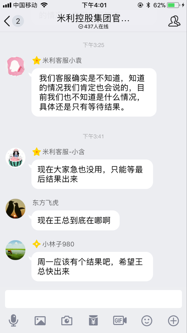 出事这么久 那些在群里叫嚷的很厉害的人 到底都做了些什么呢 一直说相信老王 相信奇迹 相信新资金不会出问题的那些领头人呢 — 米利控股(米利财富) — 2017.12.10-21:30