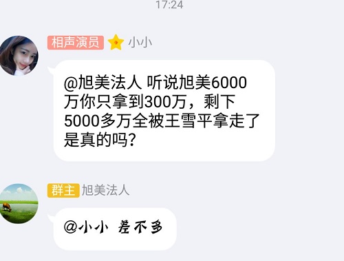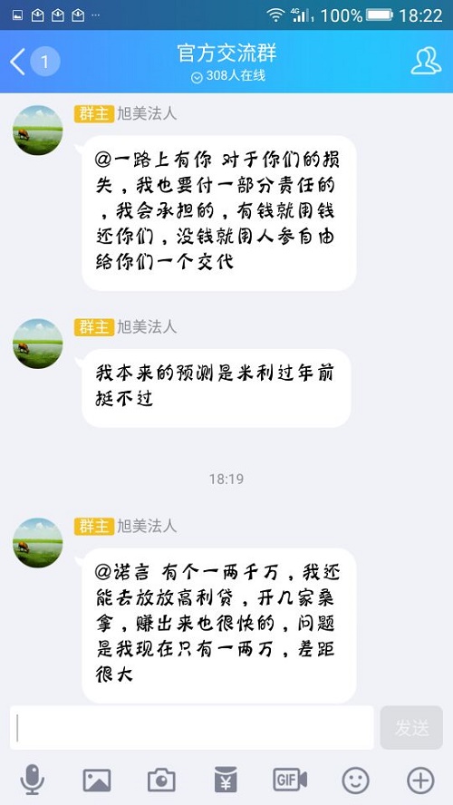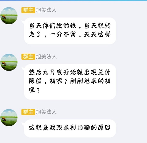 事实是王雪平九月份底资金就给旗下很多平台断了,平台法人以为王雪平国庆假出逃,拖了二个月,米利这二个月疯狂发标补缺口,但是,大户知道内幕的都不断提现,得不到提现,与平台法人冲突,平台法人与老板王雪平协调不了,最终引爆这场庞氏骗局。