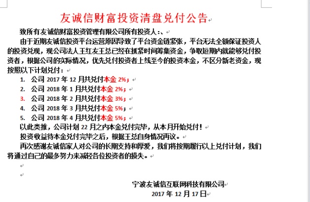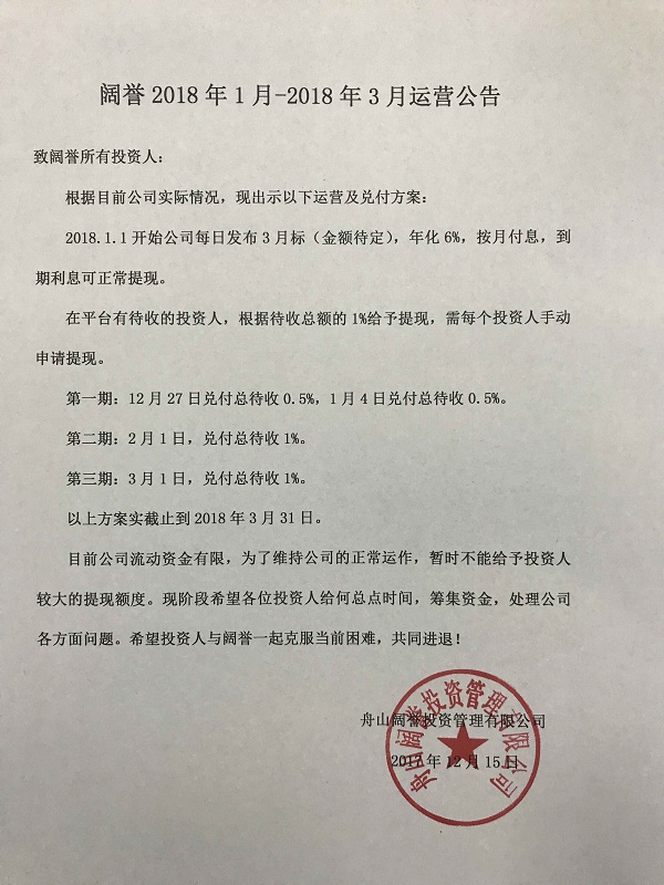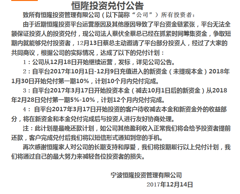 近期由于公司平台及其他原因导致平台资金链紧张,无法保障全额兑付本息。经公司法人张伟张总与投资人商议,并根据公司的实际情况,做如下说明: