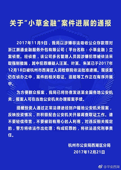 关于“小草金融”案件进展的通报 — 小草金融 — 2017.12.22-12:02