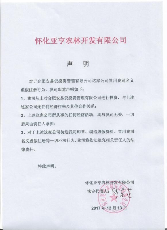 合肥安易贷投资管理有限公司官方渠道关于怀化亚亨农林开发有限公司入股该公司的信息系内部员工私刻公章与冒充法人签署文件的行为,不具实质效力,与怀化亚亨农林开发有限公司无关,目前湖南怀化亚亨农林开发有限公司已对相关人士进行追责。