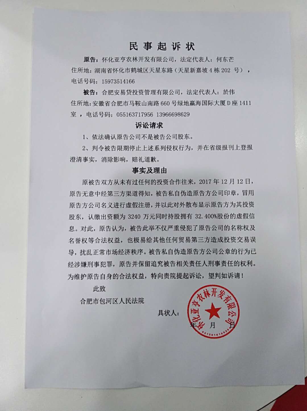 板板金服通过湖南怀化亚亨农林有限公司官方渠道得知,湖南怀化亚亨农林有限公司已经就日前合肥安易贷投资管理有限公司内部员工私刻公章并冒充法人签署文件,造假怀化亚亨农林开发有限公司入股该公司的侵权事件对涉案公司合肥安易贷投资管理有限公司提出民事诉讼,对其进行法律追责,合肥市包河区人民法院目前已受理此案件。
