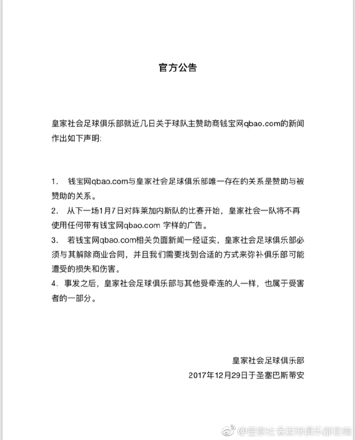皇家社会足球俱乐部关于钱宝网事件的官方公告 — 钱宝网 — 2017.12.30-1:51