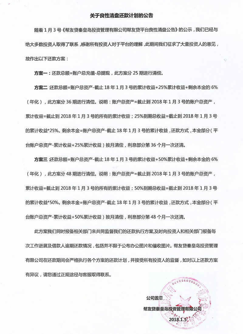关于帮友贷良性清盘还款计划的公告 — 帮友贷 — 2018.1.5-21:54