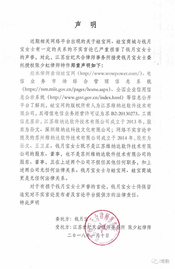 近日,网上出现了江苏梦兰集团董事长钱月宝的一些不实传言,针对这些言论,钱月宝女士委托律师特作郑重声明: