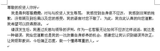 尊敬的投资人,您好。我公司发现此事后,非常重视,目前已向涉事客服了解情况,并严厉批评教育涉事客服,责令其向您道歉。望您能接受其道歉并时刻监督我公司客服人员的服务态度,如果有不满意的地方请及时向我公司运营部投诉,我公司必会严肃对待。感谢您的关注,祝您投资愉快!