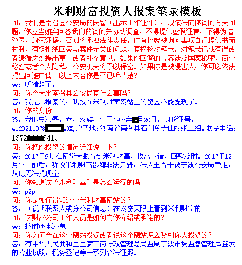 米利财富投资人报案笔录模板 — 米利控股(米利财富) — 2018.1.27-21:27
