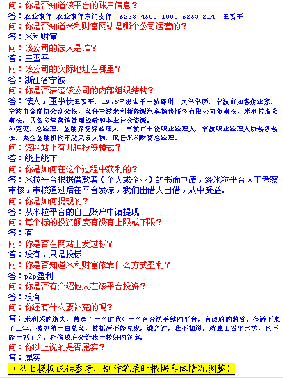 报案模板格式是真实的。全国各地的公安机关都是按照宁波公安发出的报案提问模式。总的意思就是让大家签字确认,自己是如何被米利财富骗去投资