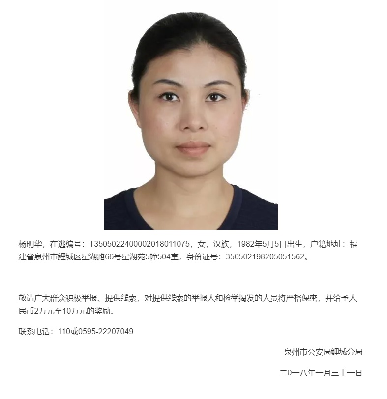 杨明华,在逃编号:T3505022400002018011075,女,汉族,1982年5月5日出生,户籍地址:福建省泉州市鲤城区星湖路66号星湖苑5幢504室,身份证号:350502198205051562。