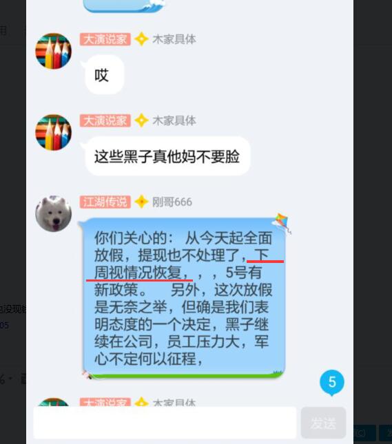 你们关心的: 从今天起全面放假,提现也不处理了,下周视情况恢复,,,5号有新政策。 另外,这次放假是无奈之举,但确是我们表明态度的一个决定,黑子继续在公司,员工压力大,军心不定何以征程,