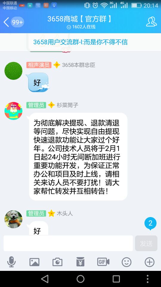 为彻底解决提现、退款清退等问题,尽快实现自由提现快速退款功能让大家过个好年。公司技术人员将于2月1日起24小时无间断加班进行重要功能开发,为保证正常办公和项目及时上线,请相关来访人员不要打扰!请大家帮忙转发并互相转告!
