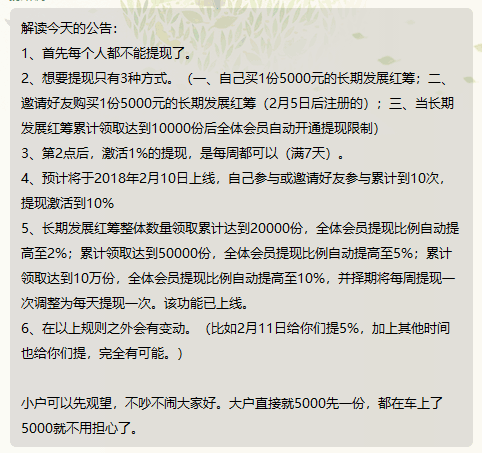 2、想要提现只有3种方式。(一、自己买1份5000元的长期发展红筹;二、邀请好友购买1份5000元的长期发展红筹(2月5日后注册的);三、当长期发展红筹累计领取达到10000份后全体会员自动开通提现限制)