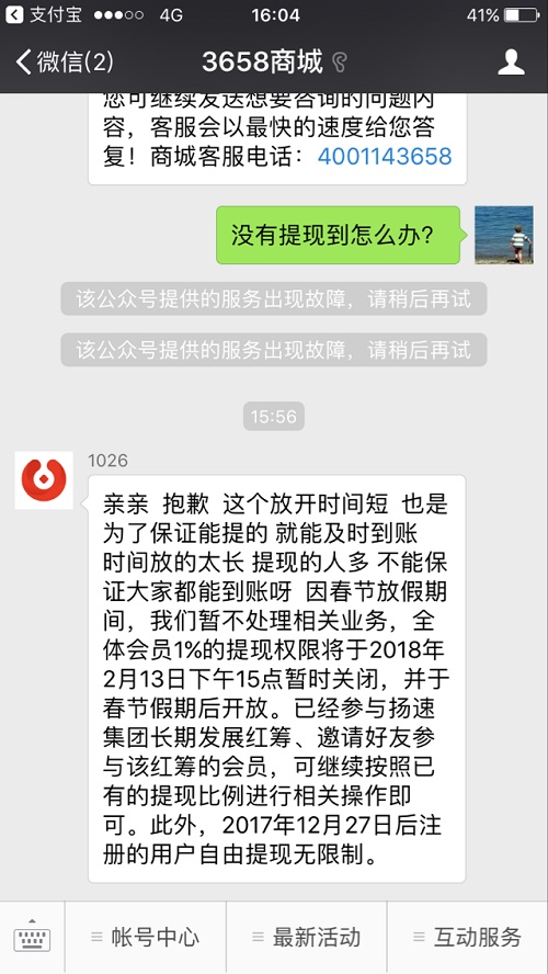 我们给全体会员的态度和承诺是一贯的,不会让任何一个会员在3658商城蒙受损失,但是在持续升级完善过程中,可能并不能立即满足您的诉求(任何企业都无法保证可以立即满足所有人的诉求),但我们将始终坚守诚信,保证全体会员利益!