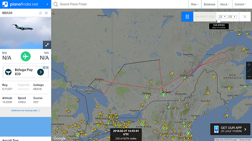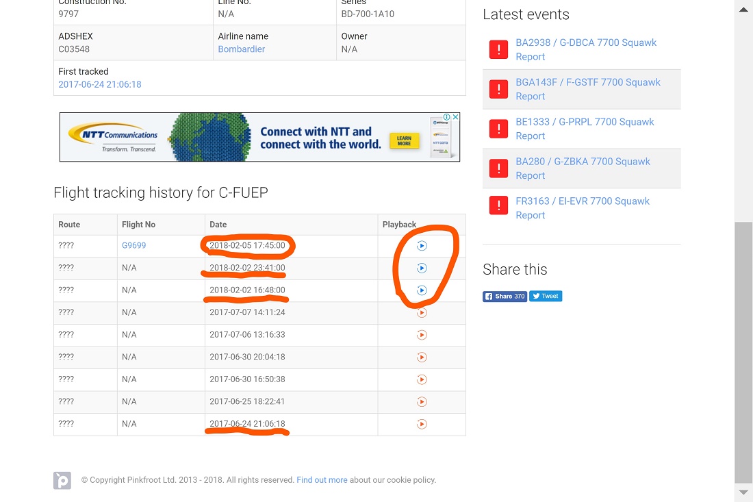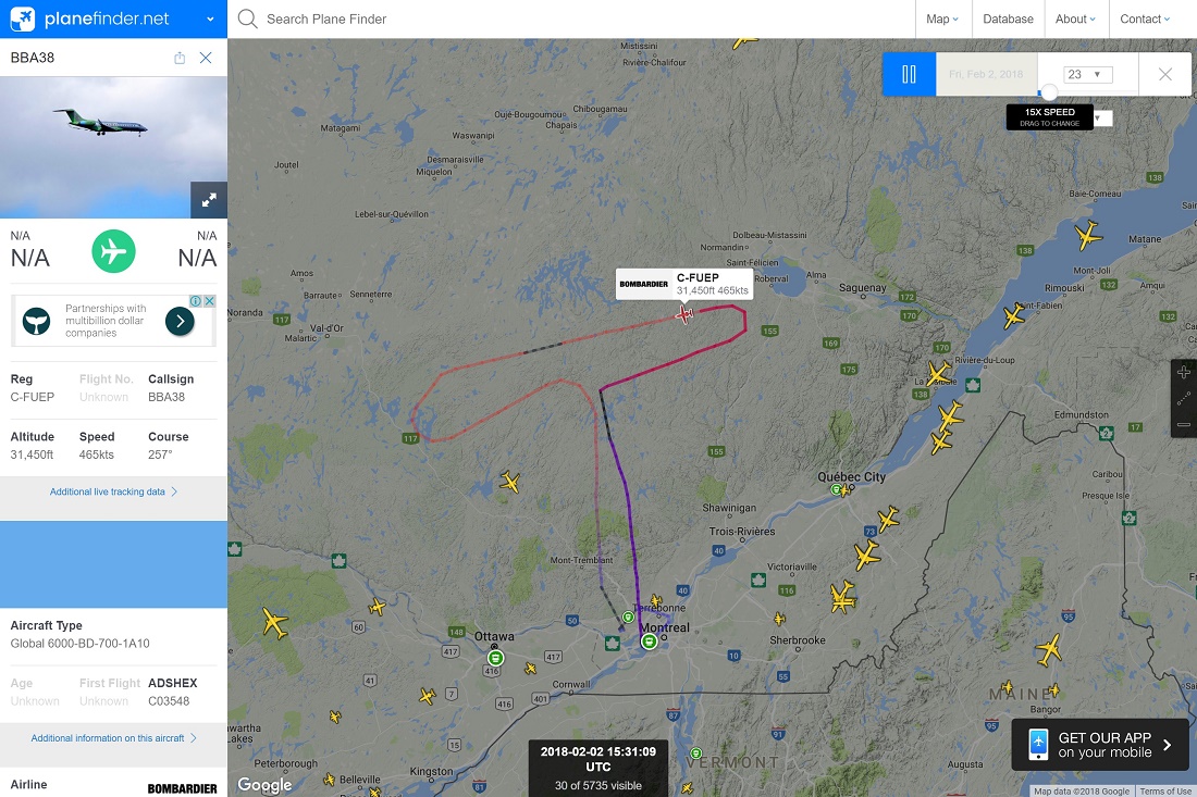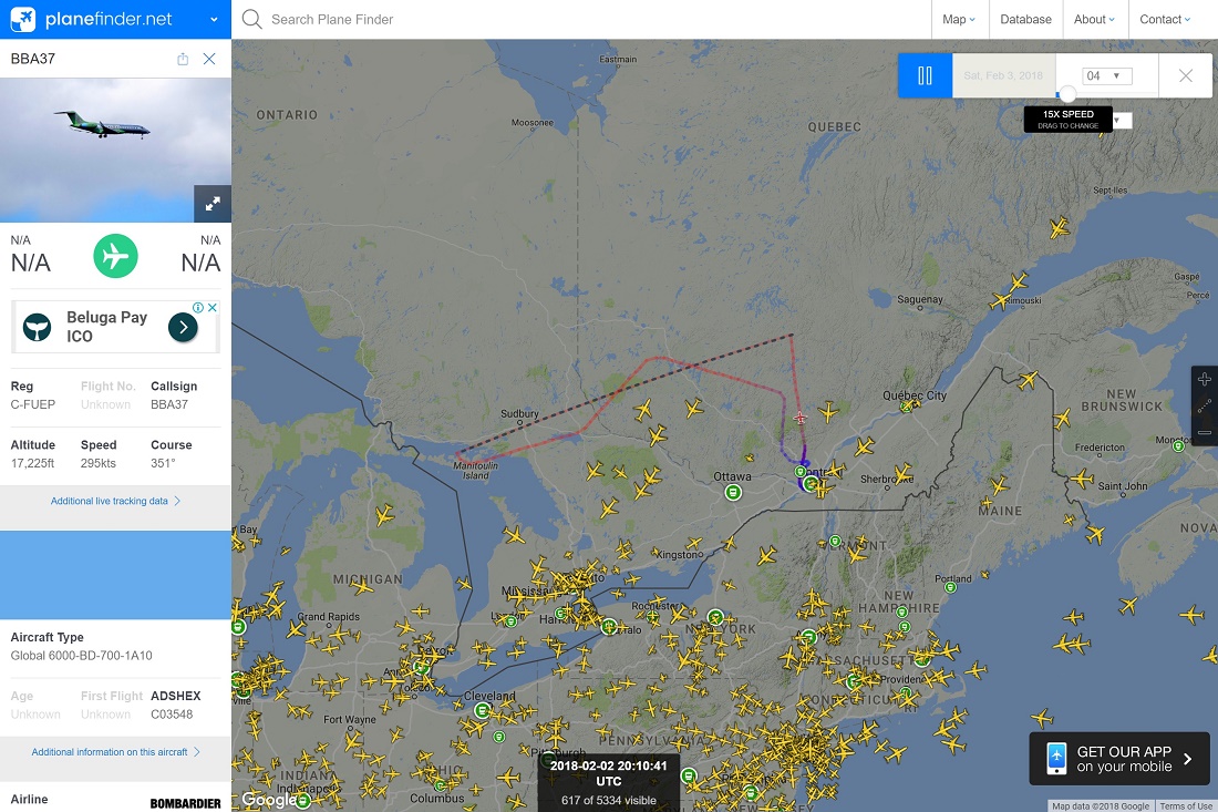 其中有三次是可以看到飞行轨迹的,这18年2月2日的一次饶了一圈还是回到蒙特利尔国际机场,可见有钱人就是爽,我们最多就是开车兜风,人家开飞机兜风!把大家的血汗钱当作粪土!(好吧,也可能因为各种原因要返航而已)