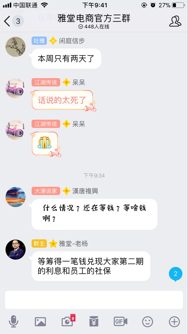 以前怎么会这么相信雅堂呢?扪心自问一下,心痛。。就像传销一样啊 手里不增长了 开始降了 提现开始大于存进去的了 就该清盘玩消失了 只是传销老大一跑了之 老杨不跑 还要安慰一下 画个饼 把股一转就没罪了。。老杨的离去终究说明:屌丝的梦想不会被人尊重只会沦为笑柄 — 雅堂金融(资金盘) — 2018.3.8-21:39