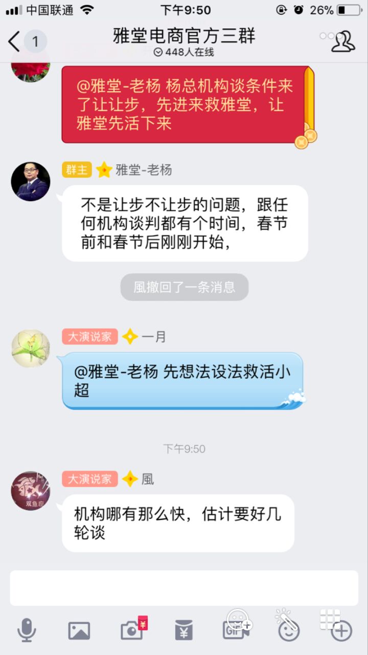 老杨原先不是想着每个月用1%不到本金来维稳 有8个月的时间和机构谈 投资人领到菜钱也不会闹 还有钱维持公司运转 这不是他自己出的方案吗? 这么好的如意算盘 今天怎么打错了?