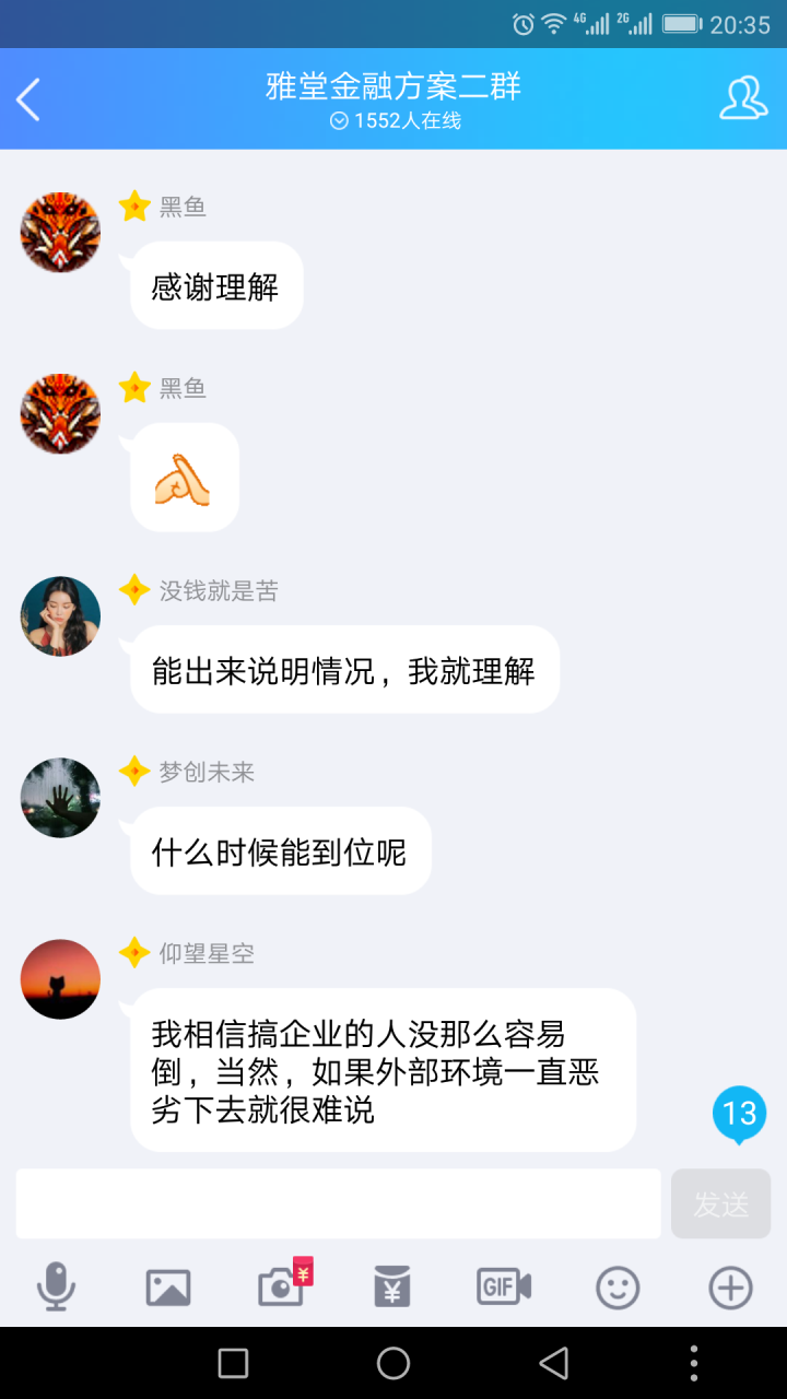 我现在头脑朦朦的,心里特别难受。。由于之前谈好的用于兑付第二期利息的短期资金未能按照约定到位,致使本期剩余利息无法兑付,向各位投资人致歉。我们一直在紧急与对方沟通,争取资金尽快到位,早日兑付利息 — 雅堂金融(资金盘) — 2018.3.9-21:06